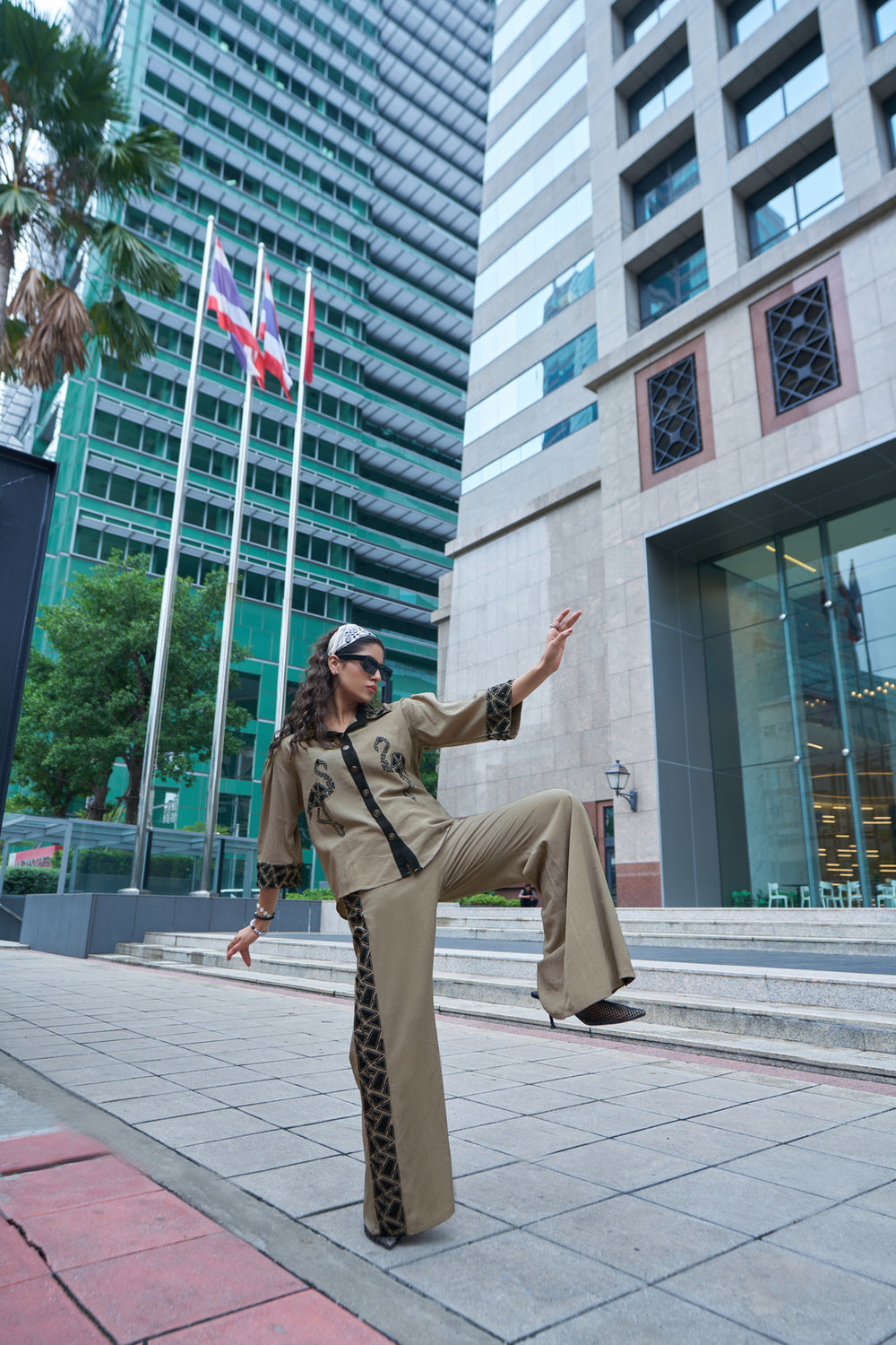 Perfect as a women’s co-ord set for office, brunch, or travel—this taupe ensemble blends timeless style with contemporary detail.